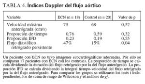 Las mediciones Doppler de las velocidades máximas, los intervalos de tiempo y las proporciones IFD no fueron significativamente distintas entre los grupos (tabla 4). Sin embargo, el 47% de los casos de ECN mostró un flujo diastólico retrógrado persistente en la aorta abdominal, frente al 15% de los controles (p = 0,04). Además, todos los pacientes con ECN estadio 2b o 3b, menos uno (86%), mostraron flujo diastólico retrógrado persistente.