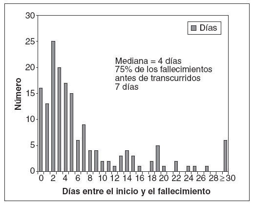 Fig. 1. Número de días entre el inicio de la gripe y el fallecimiento asociado con la gripe, Estados Unidos, 2004-2007.