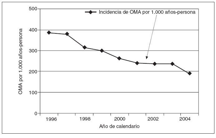 InterpretaciónEl diseño del presente estudio no nos permitió identificar la razón de que la incidencia del proceso disminuyera marcadamente entre 1998 y 2004. Parece poco probable que, durante este período, cambiara la flora microbiana o la predisposición anatómica de los niños a la otitis media. Un estudio reciente efectuado en Tennessee y en Nueva York encontró que, entre 1998 y 2002, disminuyeron las tasas de otitis media y las de inserción de un tubo de timpanostomía15. Los investigadores sugirieron que esta disminución podría deberse a la introducción en 2002 de la vacuna conjugada antineumocócica en Estados Unidos, pero no pudieron incluir en el análisis el estado de dicha vacunación. Extendiendo los años estudiados por Poehling et al15 (1998-2002), la presente investigación de visitas para la OMA durante 9 años (1996-2004) observó disminuciones similares en las incidencias de otitis media no complicada, fracaso del tratamiento y recidivas. No obstante, consideramos que la introducción de la mencionada vacuna no explica los hallazgos de la presente investigación por dos razones. En primer lugar, en la población de estudio las incidencias de OMA, FT-OM y R-OM disminuyeron, como mínimo, tanto desde 1996 a 2000 como lo hicieron desde 2000 a 2004. En segundo lugar, los ensayos aleatorizados han demostrado que la vacuna conjugada antineumocócica produce un efecto modesto sobre la otitis media16,17. Consideramos que la explicación más coherente de los resultados del presente estudio es que los médicos han cambiado sustancialmente el umbral de tratamiento de esta infección, probablemente como respuesta a la presión para reducir la prescripción de antibióticos. Este cambio en el umbral diagnóstico también explicaría las disminuciones de las tasas de recidiva y fracaso, incluso durante un período en el que ha aumentado la falta de sensibilidad a los antimicrobianos más usados.