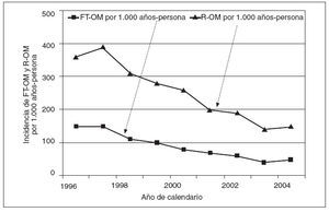 Fig. 3. Densidad de incidencia del fracaso del tratamiento de otitis media aguda (FT-OM) y recidivas (R-OM) desde 1996 a 2004.