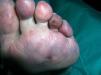 Figura 1. Livedo reticularis bilateral en plantas y dedos de los pies.