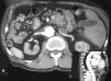 Figura 3. Angiotomografía toracoabdominal: imagen con contraste que muestra ateromas calcificados, e indentaciones en la aorta abdominal y en ambas arterias renales.