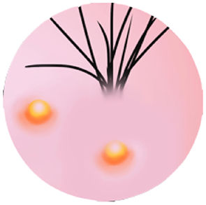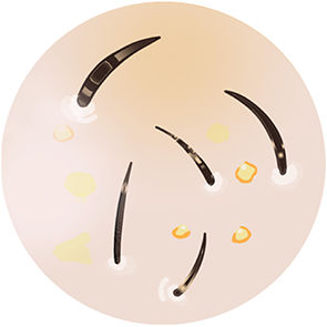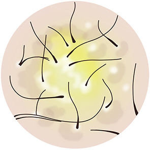 | Menos frecuentemente: pelos rotos, manchas marrones en asterisco y halo oscuro peripilar | |||