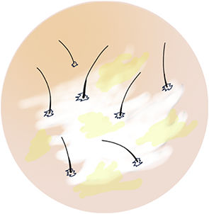 | Placa alopécica mal definida, más frecuentemente en el vértex o la zona frontal, de intensa coloración rojiza, con pústulas y erosiones | Visualización de bulbos pilosos a través de la piel atrófica, tallos tortuosos y exudación amarillenta oleosa | ||