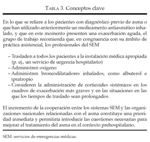 Tras el análisis de múltiples protocolos de tratamiento relativos a los niveles SVB y SVA, y aplicados en diversas jurisdicciones de todo Estados Unidos, y después de una discusión de las variaciones significativas que hay entre los sistemas SEM respecto a la formación de los profesionales, al alcance de su práctica asistencial y a los niveles de certificación, el grupo de trabajo acordó la creación de un protocolo modelo que se pudiera aplicar a los sistemas SEM de todo el país. Las intervenciones clave no distinguen entre los procedimientos SVB y SVA debido a que se consideró que los pasos recomendados para el tratamiento son muy básicos, seguros y efectivos. Los conceptos clave (tabla 3) son congruentes con las directrices NAEPP introducidas en 1991 y actualizadas en 1997 y 20028-10. El grupo de trabajo considera que para que un profesional del SEM pueda completar los procedimientos terapéuticos propuestos no es necesario que posea un conocimiento detallado de la complejidad del asma, incluyendo su diagnóstico, la determinación de su gravedad o su fisiopatología. Idealmente, la asistencia básica del asma no debe presentar diferencias en función de la capacidad asistencial o del nivel de certificación del profesional. Sin embargo, los protocolos deben reflejar los ámbitos de práctica asistencial legalmente autorizados respecto a los profesionales del SEM.