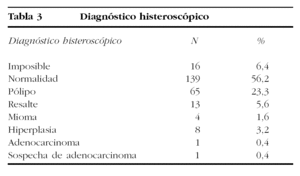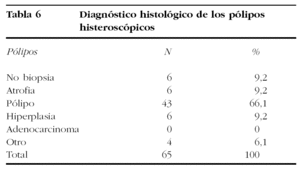 Los diagnósticos histológicos de los 65 pólipos visualizados por histeroscopia se presentan en la tabla 6.