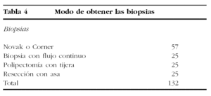 Se realizaron un total de 132 biopsias. No en todas las mujeres se obtuvo endometrio para biopsia, debido a que en los endometrios atróficos no era posible obtenerla. La forma de realizar la toma de biopsia fue diferente según cada caso particular (tabla 4). El diagnóstico anatomopatológico fue insuficiente en 46 casos. Este resultado tiene la misma explicación que ya se ha comentado; se trata de endometrios atróficos donde no es posible obtener muestra histológica o, al intentar extraerla, se obtiene una mínima cantidad de tejido que no hace posible realizar un estudio histológico. En 3 casos dieron un resultado histológico de endometrio activo, en 19 de atrofia, en 48 de pólipo, en 7 de hiperplasia simple, en 1 de hiperplasia compleja, en 3 de hiperplasia con atipias, en 3 nos encontramos con cánceres y en 2 el diagnóstico fue de otro. En la tabla 5 se muestra la correlación de los resultados anatomopatológicos con los diagnósticos histeroscópicos. Destaca la escasa correlación en el diagnóstico histeroscópico de hiperplasias.
