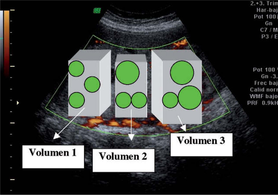 Respecto al estudio de vascularización y analizando el sistema VOCAL, se obtuvieron y almacenaron en el equipo ecográfico para su posterior evaluación off-line, 3 volúmenes placentarios, y de cada uno de ellos se extrajeron, a su vez, otras tres distintas esferas de tejido a modo de «biopsia placentaria». Son, por tanto, 9 esferas, cada una de ellas de distinta capacidad, dependiendo del grosor de la placenta correspondiente de la cual se extrae. De una manera automática, y una vez seleccionada la esfera a estudiar, el equipo calculó los diferentes índices de vascularización reportados.