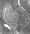 Figura 2C. Resonancia magnética pélvica (secuencia T2 sagital) con desaparición completa del mioma. Solución de continuidad (hiperintensidad de señal) en la cara posterior donde estaba implantado el mioma. Disminución general del tamaño uterino.