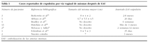 La expulsión de los miomas a través del cérvix es una complicación relativamente frecuente. El tejido necrótico del mioma se absorbe gradualmente y se expulsa por la pared uterina. Su incidencia es del 5-7%8, aunque un estudio9 señala hasta una cifra del 18%. Cuando la EAU se practica en mujeres con miomas submucosos confirmados por histeroscopia, hasta el 60% pueden expulsarse por vía vaginal. En la tabla 1 aparecen los casos descritos en la literatura médica.
