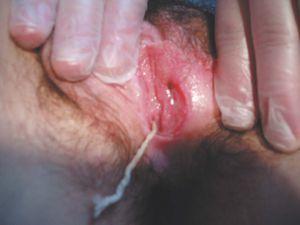 En la exploración se apreció: importante edema vulvar (fig. 1), sobre todo en el labio menor izquierdo, en el que además en su cara interna presenta una úlcera de fondo azulado y secreción blanquecina muy dolorosa; asimismo, presentaba otra lesión más pequeña de iguales características en el labio menor derecho; pequeñas adenopatías inguinales bilaterales; temperatura 39 °C; amigdalitis.
