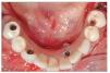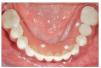 En el plazo de 48 h después de la cirugía, se colocaba una prótesis provisional de resina acrílica con 10 dientes (fig. 3). Los contactos en céntrica y laterales se limitaban a la zona intercanina. Se tomaba una radiografía panorámica para comprobar la posición de los implantes y su acoplamiento con los componentes de la prótesis.