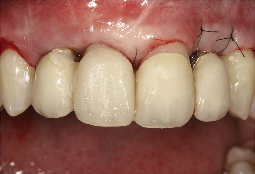La reabsorción del hueso vestibular secundaria a la ex y la poca distancia que suele existir entre los cuerpos de los implantes, además de otros factores, ha-cen que en general sea muy difícil evitar la pérdida de la papila entre dos implantes adyacentes2. Por consiguien-te, desde una perspectiva estética es preferible utilizar un puente a extensión o un puente combinado diente/im-plante en los dos lados de un espacio edéntulo1.