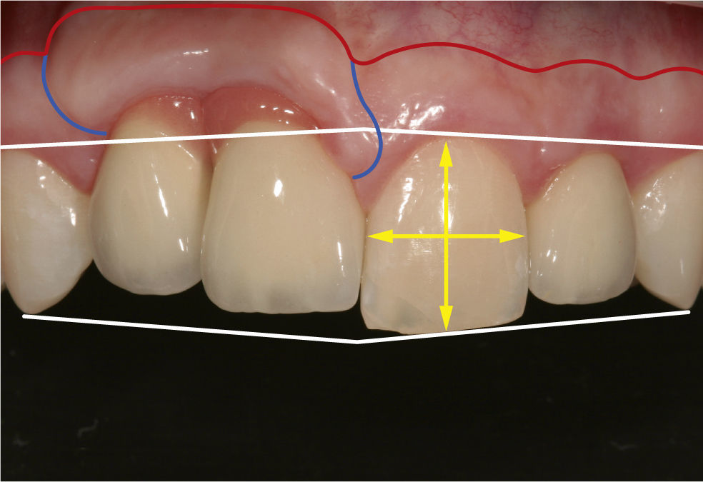 Las situaciones con dos espacios edéntulos adyacentes en la zona anterior de la arcada superior y en presen-cia de una línea de sonrisa alta revisten el máximo grado de dificultad en implantología4. En el análisis del riesgo estético numerosos factores hablaban a fa de un riesgo terapéutico alto del caso tanto en el primer abordaje como en el momento del retratamien-to. Las expectativas de la paciente eran elevadas, al igual que la trayectoria labial, el festón de los dientes adyacentes era pronunciado y los dientes adoptaban una forma triangular en la zona cervical. La anatomía de la cresta ósea alveolar mostraba un déficit conside tanto en su dimensión horizontal como vertical. La situación del tejido blando era similar. El espacio edéntulo abarcaba dos anchuras dentarias en una he-micara.