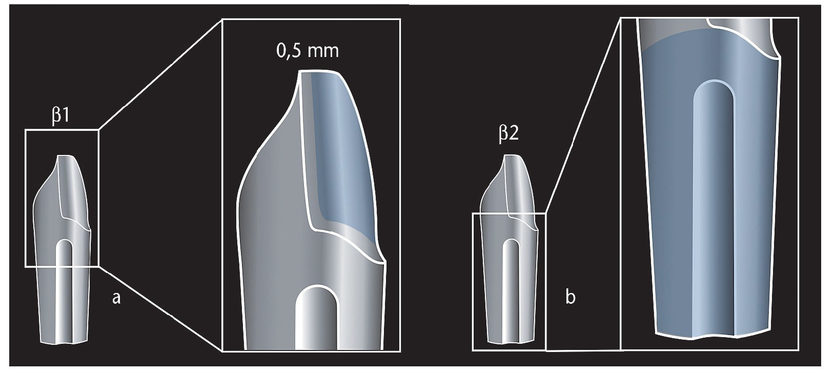 Fig. 6. El muñón beta-1 con barniz distanciador a 0,5 mm del límite de la preparación (a), el muñón beta-2 con endurecedor de yeso en la zona de la raíz (b).