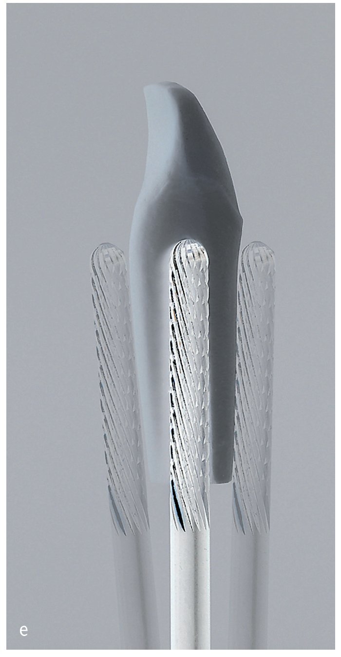 3. Separación de los muñones. Utilizando un disco diamantado grande (Visionflex 6924.104.400, Brasseler, Lemgo, Alemania) se separan entre sí los muñones a 10.000/min, primero radial y a continuación proximalmente (figs. 3b a 3d). Para el mecanizado de precisión se utiliza una fresa de carburo de tungsteno de lados paralelos con punta de trabajo redonda (H364RE.104.023, Brasseler). La conicidad creada es de 6º (figs. 3e y 4a). Estos muñones se denominan ahora muñones alfa. Forman la primera generación de muñones y, por consiguiente, la reproducción de las preparaciones reales de los dientes más fiel al original. En las superficies mesial y distal de las raíces artificiales se incorporan ranuras de guía 2 mm hacia apical del límite de la preparación. Dichas ranuras actúan como topes de inserción verticales, además de impedir la rotación. A fin de asegurar la vía de retirada, debe procurarse cuidadosamente que las ranuras permanezcan axialmente simétricas (es decir, planas). En caso de simetría axial deficiente, el muñón se enclavará por efecto cuña en la base de los alveolos dentogingival (fig. 4b).