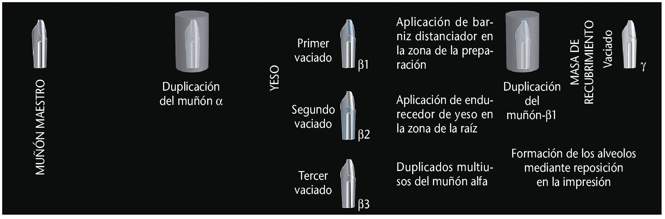 5. Los duplicados del muñón alfa se denominan muñones beta. La figura 5 ilustra la secuencia de todos los pasos de la duplicación. El muñón beta-1 se forma a partir del primer vaciado de la silicona de duplicado alfa. Éste se recubre 0,5 mm hacia coronal del límite de preparación con barniz distanciador (Die Spacer, Benzer Dental AG, Zúrich, Suiza) (fig. 6a). Si se utiliza una técnica de masa de recubrimiento, es preciso duplicar en silicona el muñón beta-1. De esta manera se obtiene una tercera generación de muñones. Estos muñones gamma se vacían en masa de revestimiento. Si se utiliza una técnica de estructura convencional (por ejemplo, metal, óxido de aluminio o dióxido de zirconio) los márgenes se marcarán con un rotulador rojo y a continuación se sellarán al muñón.