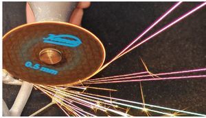 Fig. 12. La técnica de corte muestra el proceso de transformación del titanio en óxido de titanio. Cada chispa pone de manifiesto la oxidación visible con el oxígeno del aire.