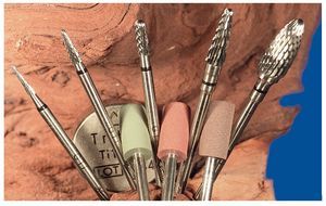 Fig. 3. Instrumentos especiales para el acabado del titanio. Para el trabajado grueso del titanio (GTi) se utilizan fresas de la firma Gebr. Brasseler, Lemgo, Alemania, especialmente desarrolladas para titanio. Éstas contribuyen decisivamente a superar los problemas durante el trabajo con el titanio.