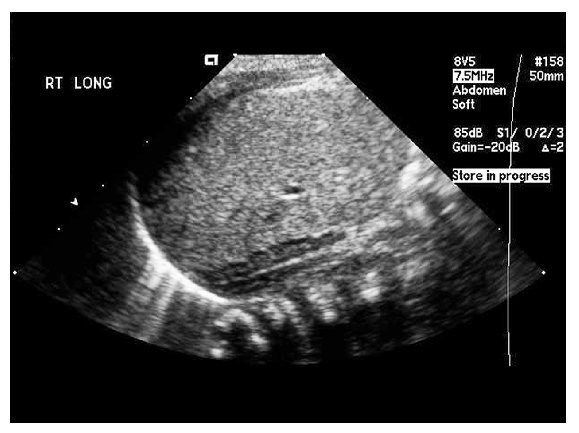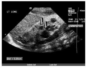 Fig. 1. Riñón izquierdo: se objetivan múltiples quistes no comunicantes en el polo inferior (flechas), reconociéndose tejido renal en el tercio medio.