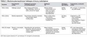 En conclusión, el BPP es un tumor torácico excepcional que aparece en niños menores de 6 años; presenta manifestaciones radiológicas diversas, se puede asociar a patología pulmonar quística congénita y comenzar con un neumotórax.