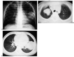La TC mostró las masas sólidas homogéneas con discreta captación de contraste, la compresión pulmonar, el desplazamiento mediastínico, el derrame pleural y los nódulos dentro de la cavidad pleural; en ningún caso hubo afectación de pared torácica ni extensión al canal raquídeo. El diagnóstico diferencial de una masa pleuropulmonar de gran tamaño en un niño pequeño debe hacerse con el sarcoma de Ewing, el tumor de Askin, el neuroblastoma y el rabdomiosarcoma. En todos estos existe mayor o menor afectación de la pared torácica, lo que no ocurre en los BPP.