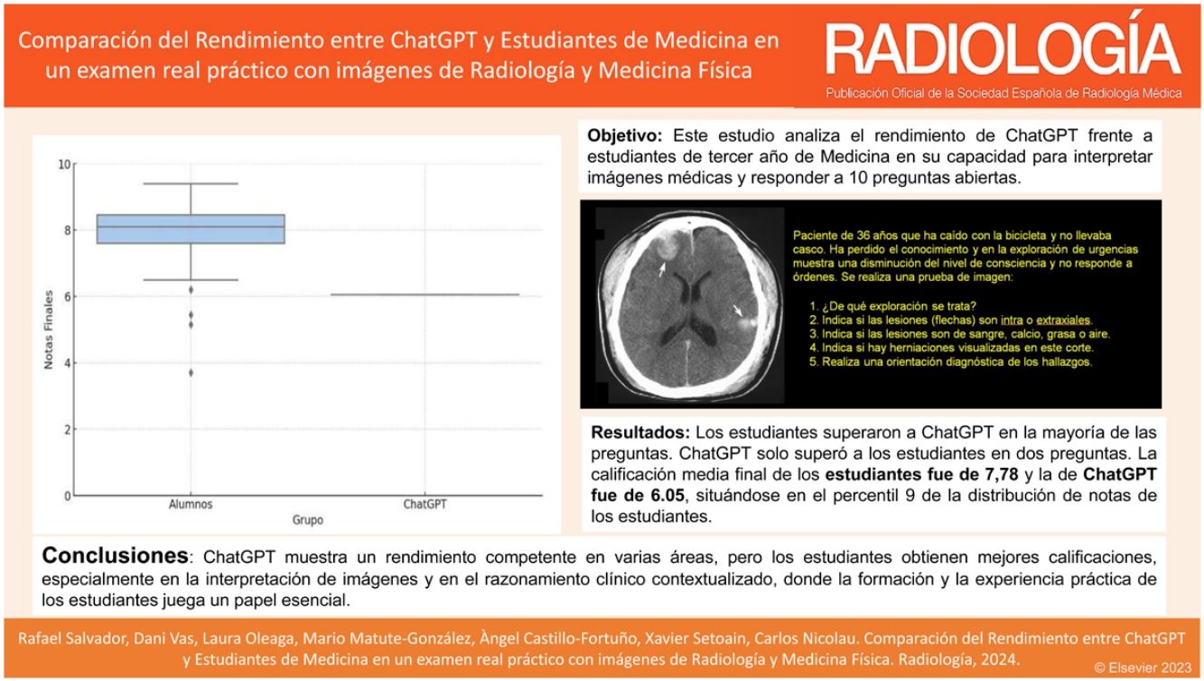 Los modelos de inteligencia artificial ofrecen la capacidad de generar respuestas textuales a una amplia variedad de preguntas, incluidas aquellas relacionadas con temas médicos. Recientemente, han incorporado la posibilidad de interpretar y responder a consultas basadas en imágenes, incluyendo imágenes radiológicas. El objetivo principal del estudio es analizar el rendimiento de ChatGPT-4o frente a estudiantes de tercer año de Medicina en una prueba práctica de la asignatura de Radiología y Medicina Física. Como objetivo secundario pretendemos valorar la capacidad de ChatGPT para interpretar imágenes médicas y responder a preguntas sobre las mismas.