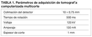 Además de las reconstrucciones axiales convencionales, en todos los pacientes se realizaron reconstrucciones multiplanares (MPR), proyecciones de máxima intensidad de señal (MIP) y reconstrucciones volumétricas o volume rendering (VR). Estas imágenes se obtuvieron en diferentes planos espaciales y con distintos espesores de reconstrucción. Las MPR se realizaron con espesores de reconstrucción de 1 mm, y las MIP de entre 5 y 10 mm, según los casos. Las reconstrucciones VR abarcaron rangos de entre 5 y 30 mm de espesor de corte. Dichas proyecciones se realizaron aplicando segmentación ósea no automática cuando fue requerido, y respetando los parámetros estándar de reconstrucción suministrados en el equipo de TCMC. En este trabajo de posproceso se empleó el software de reconstrucción A 70 A en 229 exploraciones y syngo CT 2006 G en 61 ocasiones.