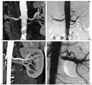 Fig. 1. (A) Reconstrucción de tipo máxima intensidad de señal (MIP) coronal en la que se muestran sendas estenosis de grado II en los ostia de las arterias renales principales. Hay calcificaciones profusas, pero que no impiden la correcta evaluación, y una dilatación posestenótica en la arteria derecha. En el lado izquierdo se identifica también un vaso accesorio de características normales. (B) Angiografía con sustracción digital (ASD) en la que se corroboran los hallazgos de la tomografía computarizada multicorte con estenosis en los vasos arteriales. (C) Estenosis de grado III en el ostium de la arteria renal izquierda; MIP coronal. (D) Detalle de la estenosis arterial de alto grado, preoclusiva, en la ASD.