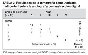 En las TCMC se determinó la presencia de 19 arterias renales normales, 15 estenosis de grado I, 25 estenosis grado II, 10 estenosis de grado III y dos oclusiones arteriales. Los resultados del diagnóstico realizado con la TCMC en relación con la ASD se exponen en la tabla 2. En 56 ocasiones el diagnóstico conseguido con la TCMC fue igual al de la ASD, con una concordancia del 78,8%; k = 0,72 (IC 95%: 0,59-0,84). Es de destacar que todas las estenosis de grado III fueron detectadas con TCMC, y que en 9 de los 10 casos (90%) en que se sugirió esta posibilidad, el diagnóstico fue certero. Por otro lado, la TCMC sobrevaloró estenosis en 13 ocasiones (18,3%).