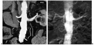 Fig. 4. (A) Reconstrucción coronal de máxima intensidad de señal en la que se identifica una imagen de doble pared en la vertiente inferior de la arteria renal principal izquierda, que sugiere una disección espontánea. (B) En la angiografía con sustracción digital se observa una arteria íntegra y de características normales, descartándose el diagnóstico inicial de disección. El hallazgo muy probablemente fue motivado por un artefacto de vigoroso pulso arterial.