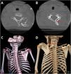 En la TC se identifica una elevación de la escápula izquierda, atribuible a deformidad de Sprengel (fig. 2C). Además, se aprecia un hueso omovertebral que articula superiormente con la apófisis espinosa/lámina izquierda de C5 (fig. 2A) e inferiormente con el borde medial de la escápula a la altura de D2, sin fusión ósea (fig. 2B). El borde supero-medial de la escápula izquierda queda a la altura de la apófisis espinosa de C4 (fig. 2D).