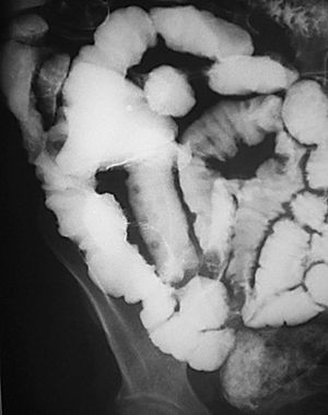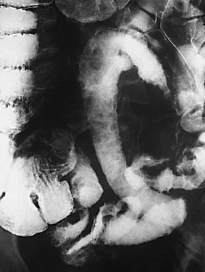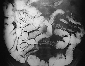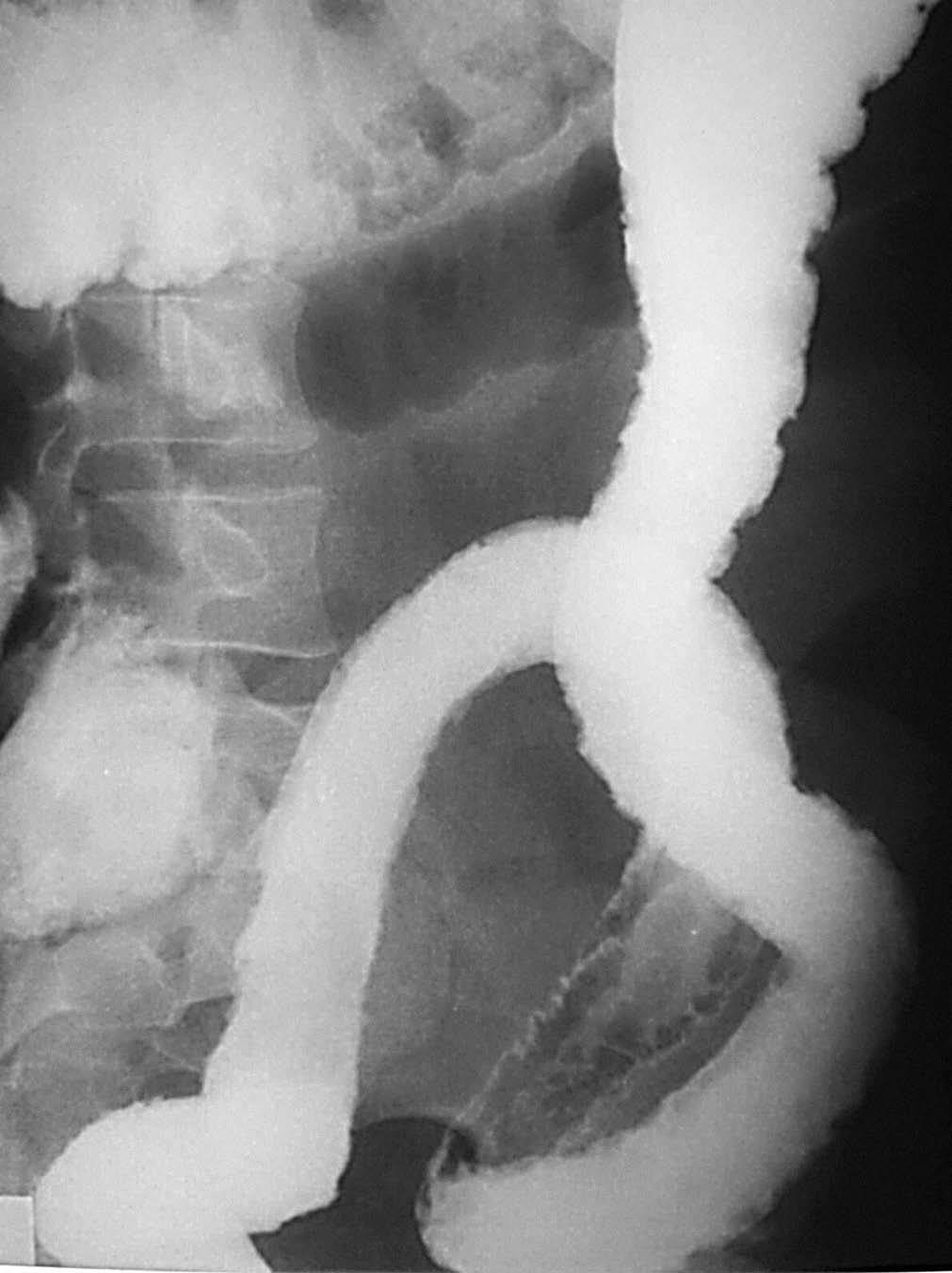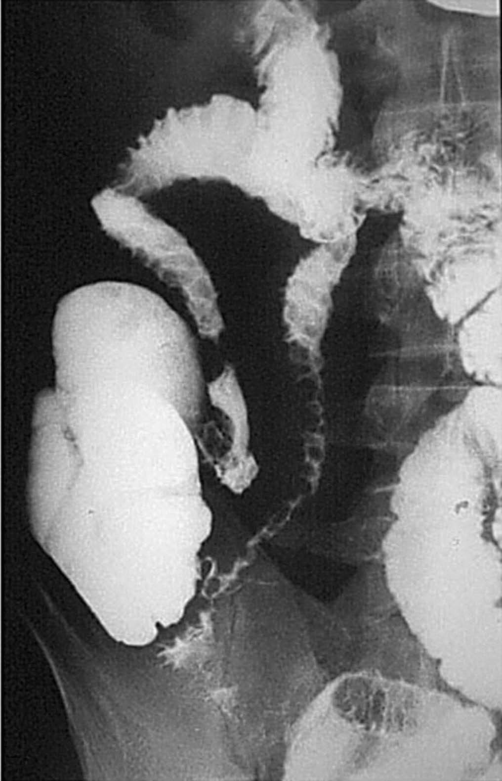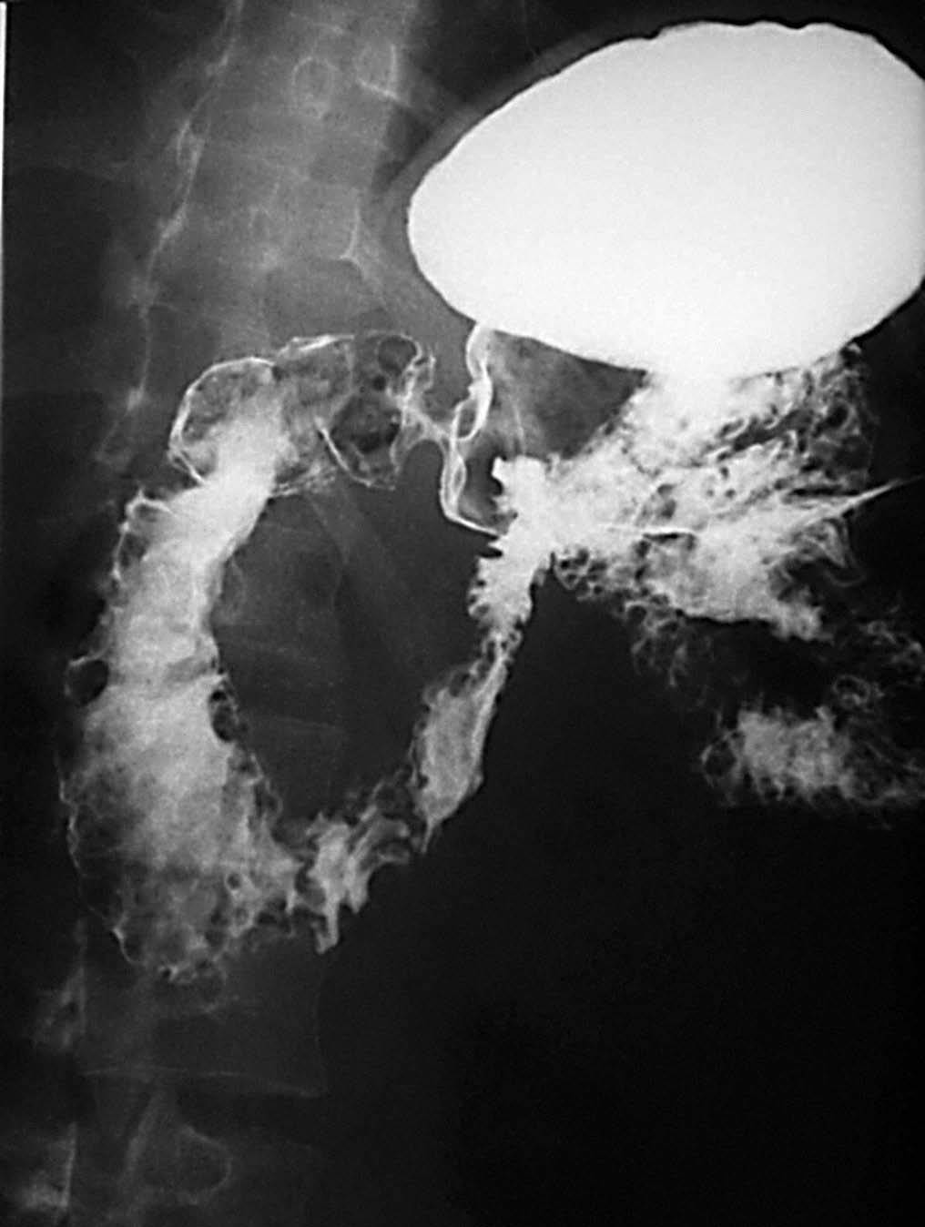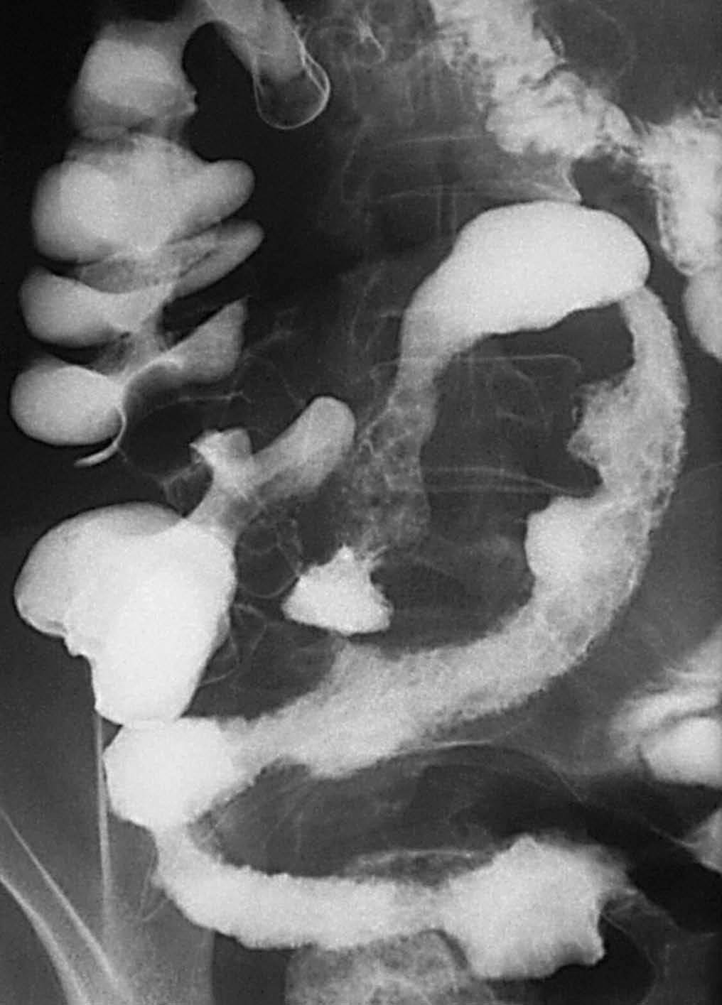 Como consecuencia de la afectación asimétrica y discontinua de la pared intestinal se encuentra una rectificación y enderezamiento del borde mesentérico y una serie de saculaciones antimesentéricas similares a las de la esclerodermia aun cuando presentan un mecanismo patogénico diferente13.
