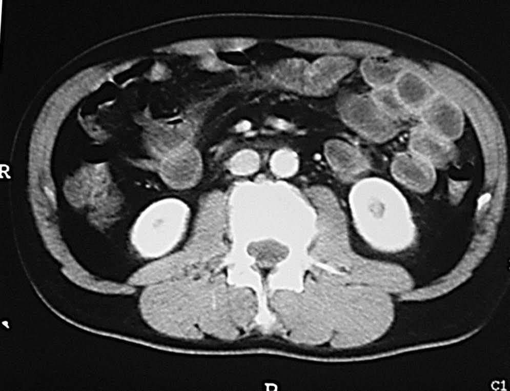 En la TC también se definen estas ulceraciones con aspecto en "vía de tren" de la pared del marco cólico. El aspecto estratificado de la pared del colon se ha denominado clásicamente como signo de la "diana" o del "doble halo". El anillo central de baja densidad corresponde al edema en la submucosa, con relación al componente inflamatorio activo. En las fases subaguda o crónica esta baja densidad de atenuación en la submucosa corresponde al depósito graso21.