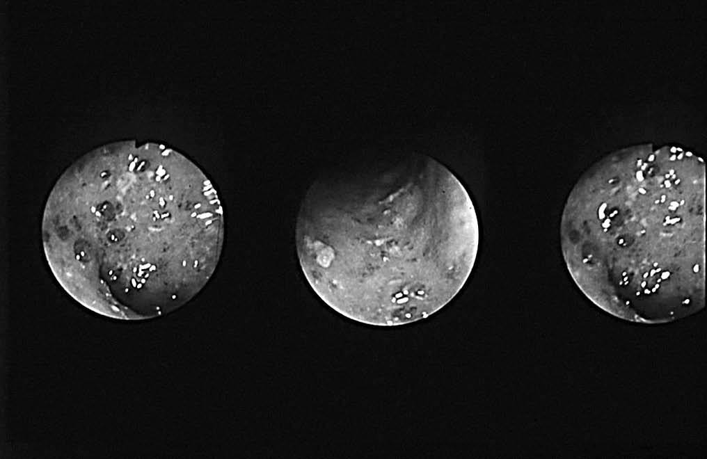 En fases avanzadas la mucosa es atrófica con alguna discreta zona de estenosis y con presencia de pólipos hipertróficos de aspecto regenerativo.