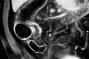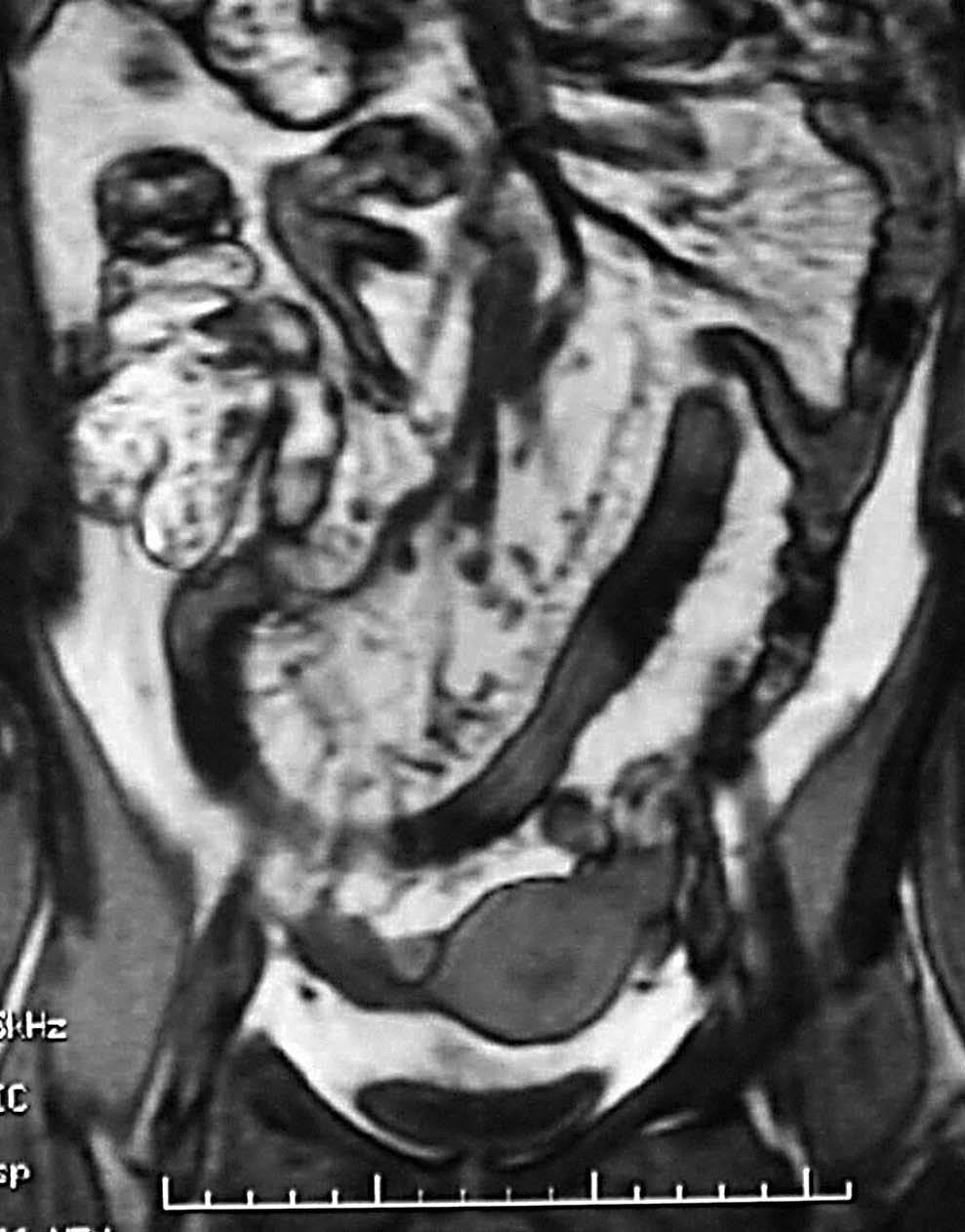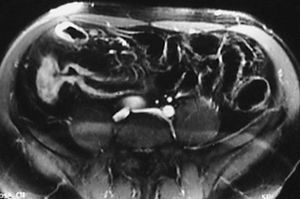 La RM es una técnica que surge con un gran potencial en el estudio del intestino delgado, fundamentalmente en pacientes de este tipo, puesto que no supone radiación ionizante. Se trata de una patología inflamatoria crónica, de carácter recurrente, en pacientes jóvenes con una gran esperanza de vida, en los que hay que minimizar la exposición a radiaciones ionizantes, y probablemente en un futuro no lejano la RM va a ejercer un importante papel en el estudio de estos pacientes. En concreto la RM ha demostrado gran precisión en el estudio de las fístulas anorrectales, a la hora de determinar y diferenciar los trayectos fistulosos7,8.