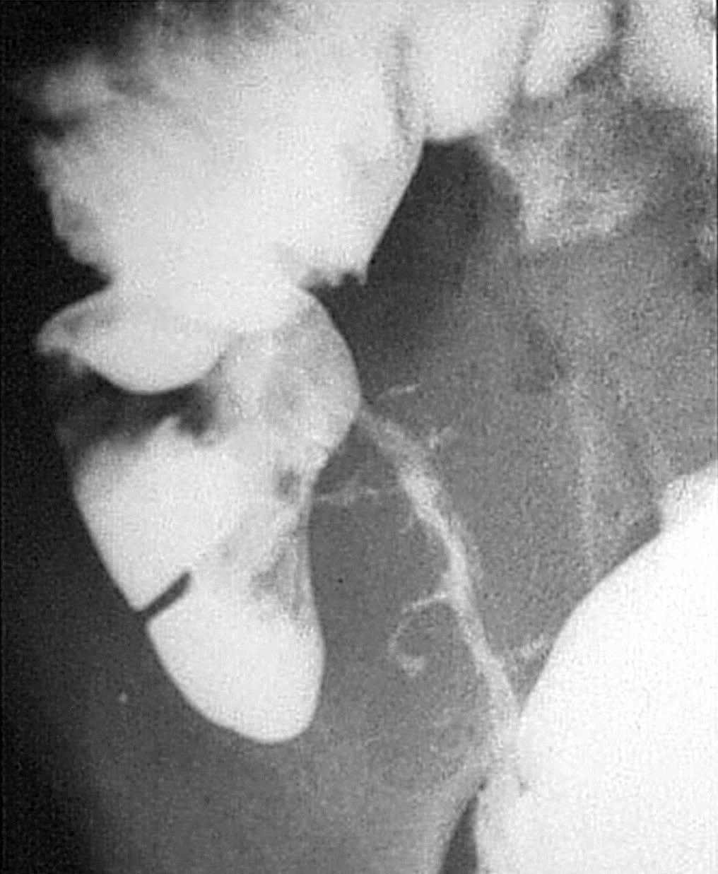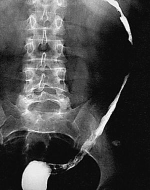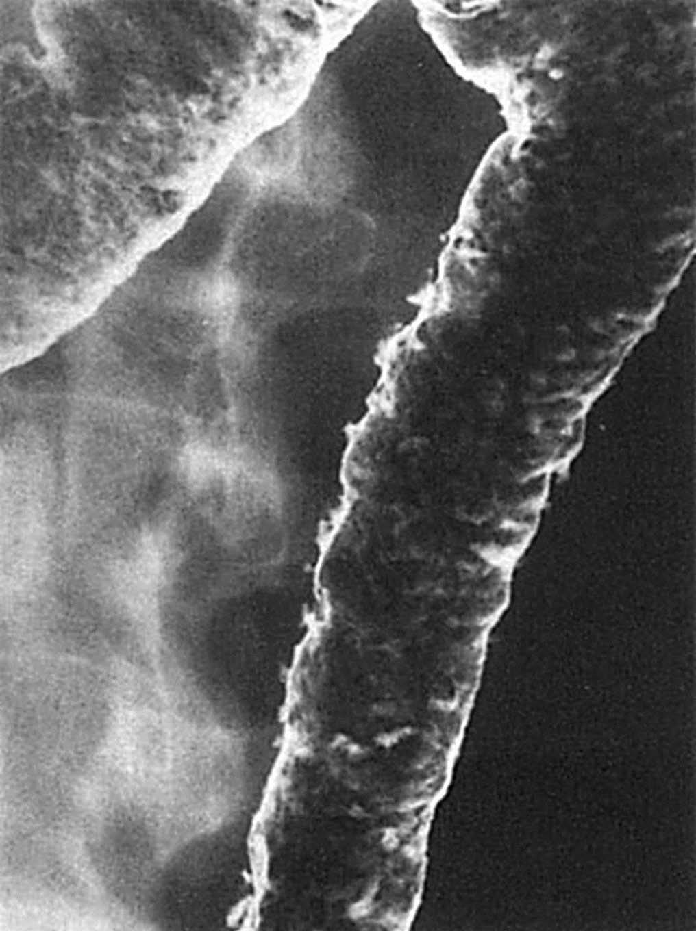 Fig. 14.--Aspecto final de la colitis ulcerosa con esa apariencia rígida, carente de haustración por la contracción mantenida de la muscularis mucosa.