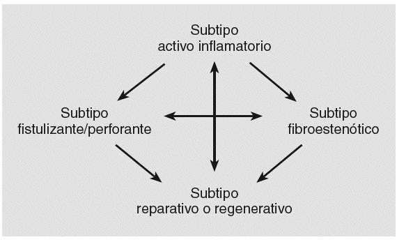 Estos subtipos van a requerir un tratamiento diferente. Por ejemplo, la presencia de un cuadro obstructivo en un paciente con un subtipo activo-inflamatorio va a justificar un tratamiento médico intenso y continuado, mientras que ese mismo cuadro obstructivo en un paciente con un subtipo fibroestenótico no va a ser susceptible de tratamiento médico, va a requerir tratamiento quirúrgico o algún tipo de maniobra intervencionista. Lo mismo ocurre con el subtipo fistulizante-perforante, donde van a ser los hallazgos radiológicos los que definan si ese paciente sigue un tratamiento médico, si se intensifica el mismo con azatioprina o ciclosporina o si, por el contrario, habrá que llevar a cabo un tratamiento quirúrgico. Es preciso matizar que no son subtipos estanco, sino que en un mismo paciente pueden coincidir varios de estos subtipos en una u otra situación3. A continuación se van a analizar los criterios semiológicos desde el punto de vista radiológico de cada uno de estos subtipos.