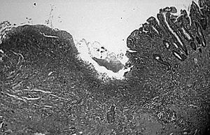 En una fase inicial hay edema e hiperemia con descamación de células inflamatorias que obliteran las criptas de Lieberkhün, dando lugar a los microabcesos crípticos, que son patognomónicos de esta enfermedad. A partir de estos microabscesos crípticos surgen las ulceraciones en "T" o ulceraciones en "botón deración. En fases más avanzadas existe una contracción crónica de la muscularis mucosa, y a partir de ahí aparecen las posibles complicaciones: dilatación tóxica o incluso en casos crónicos muy evolucionados, la posibilidad de degeneración neoplásica.