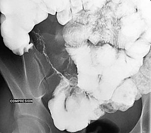 En la etapa inicial los hallazgos propios de la EII en el tránsito baritado son muy sutiles, tal vez discreto grado de espasmo con cierto grado de irritabilidad o alteración de la distensibilidad. De ahí que el estudio baritado tiene que ser realizado con una técnica exquisita, con sumo detalle, con compresión cuidadosa de cada una de las diferentes asas (fig. 3).