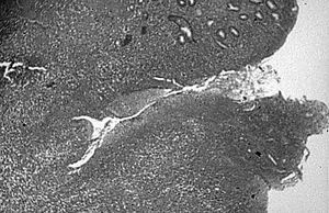 Fig. 10.--Enfermedad de Crohn. El subtipo fistulizante-perforante se caracteriza por la presencia de ulceraciones penetrantes en el contexto de un proceso inflamatorio activo a nivel de la pared. (A) Estudio baritado que revela la existencia de ulceraciones penetrantes. (B) Correlación microscópica de una de esas ulceraciones penetrantes, con su aspecto serpinginoso y anfractuoso, irregular, rodeada por el infiltrado inflamatorio.