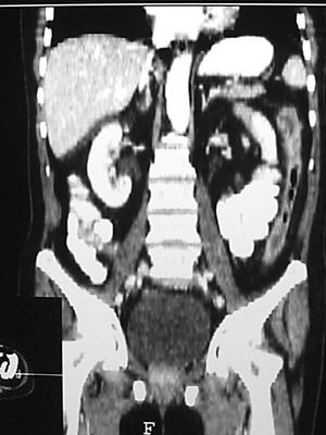 Fig. 12.--Enfermedad de Crohn. A) La tomografía computarizada (TC) muestra la afectación del colon de carácter segmentario.(B) En la reconstrucción en plano coronal (MPR) puede apreciarse el marcado engrosamiento mural del colon descendente.