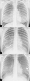 Figura 3.Hallazgos atípicos de neumonía COVID-19. A) Neumonía lobar. Varón de 28 años con clínica compatible con enfermedad COVID-19 y PCR positiva para SARS-CoV-2. Radiografía de tórax en proyección posteroanterior (PA). Afectación del lóbulo superior derecho (flecha). B y C) Afectación bilateral y derrame pleural. Varón de 17 años con fiebre y PCR positiva para SARS-CoV-2. Radiografía de tórax PA (B) y lateral (C). Tenues infiltrados bilaterales en campos inferiores (flechas) con mínimo derrame pleural en el seno costodiafragmático posterior izquierdo (punta de flecha).