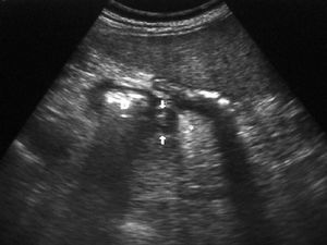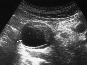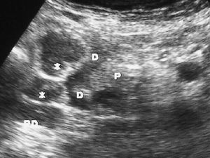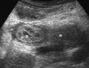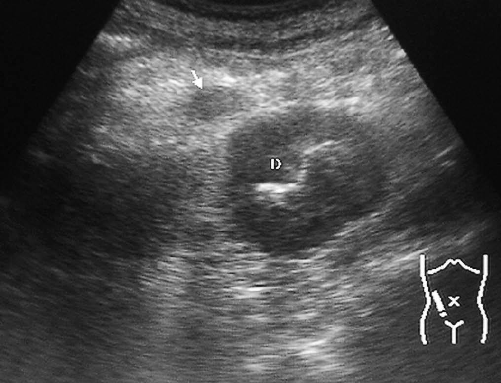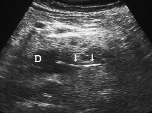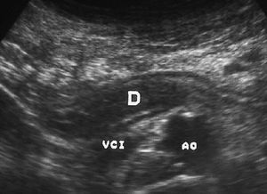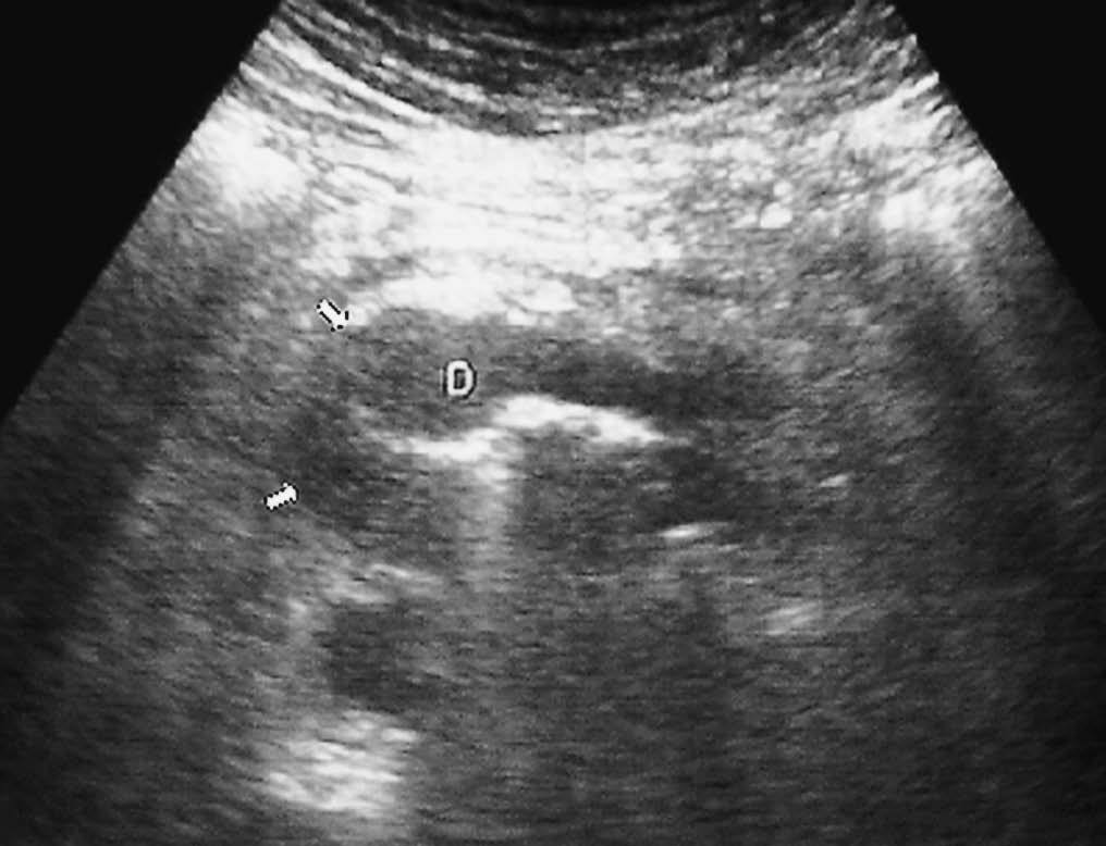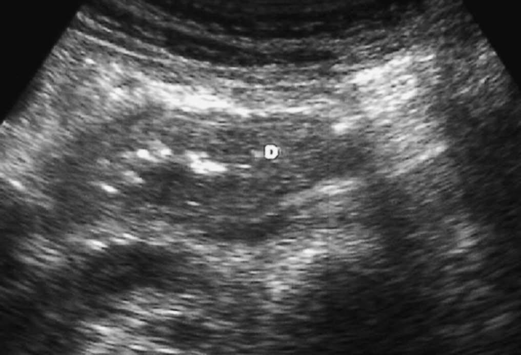 Fig. 6--Hematoma de pared. Ecografía que muestra un engrosamiento mural homogéneo de la tercera porción duodenal (D) en un paciente con púrpura de Schönlein-Henoch y dolor abdominal.