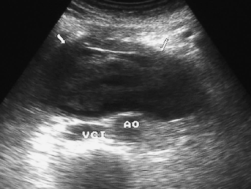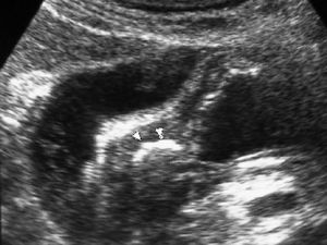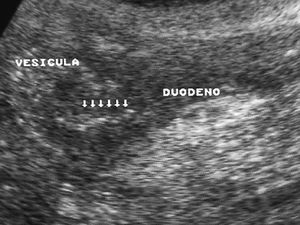 La colecistitis también puede afectar al duodeno, produciendo un engrosamiento de pared secundario a la extensión de la inflamación vesicular. Dicha inflamación puede provocar un absceso de pared duodenal (fig. 13). La existencia de un nivel hidroaéreo en la TC sugiere que se ha producido una comunicación con la luz intestinal. La inflamación puede progresar y perforar la pared duodenal ocasionando una fístula bilioduodenal, identificándose en la ecografía como un trayecto hipoecoico con paso de contenido ecogénico (gas) entre vesícula y duodeno. También se puede observar la presencia de aire en vesícula, que puede extenderse al resto de la vía biliar (neumobilia) (fig. 14). La salida de la colelitiasis a través de la fístula y su impactación en el tracto intestinal puede producir un íleo biliar20.