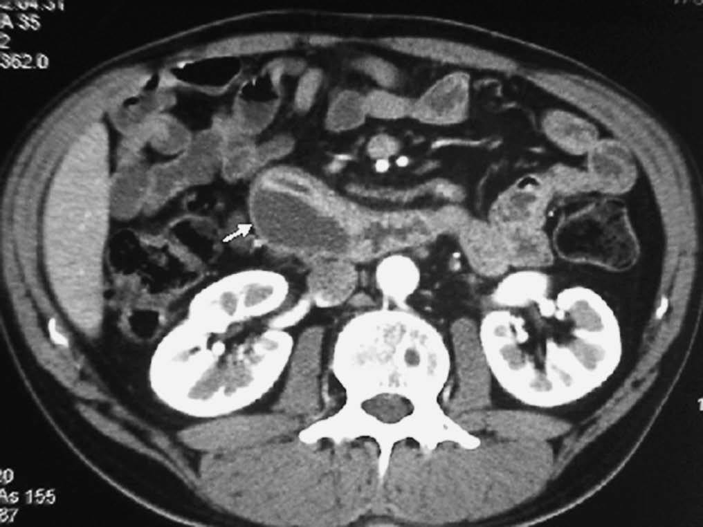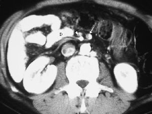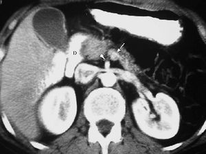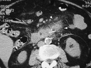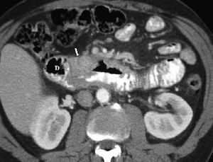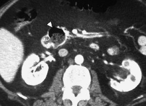 Fig. 2--Divertículo duodenal. Tomografía computarizada con contraste intravenoso. Se observa una estrucutra sacular (punta de flecha) en contacto con luz duodenal (D), con aire y material en su interior.