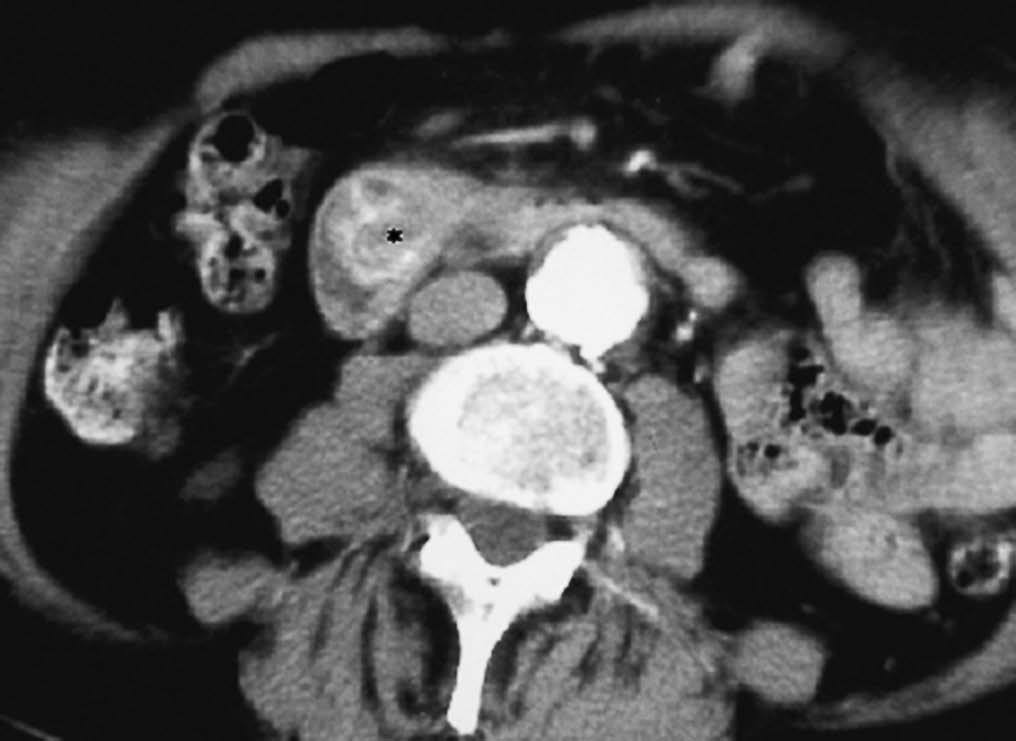 Fig. 17--Adenoma velloso. Tomografía computarizada con contras te intravenoso mostrando una tumoración bien delimitada (*) con captación de contraste localizada en la luz duodenal en región ampular.