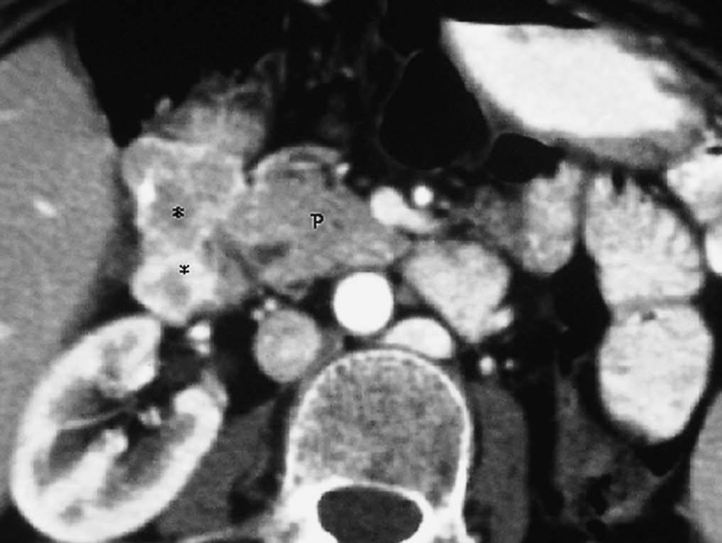 Fig. 12--Pancreatitis del surco. Tomografía computarizada con contraste intravenoso. Lesión hipodensa (*), mal definida, que oblitera el plano graso normal entre páncreas (P) y duodeno (D) y con escaso realce.