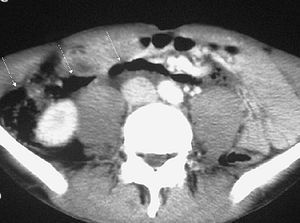 Fig. 3--Perforación duodenal traumática. Estudio de tomografía computarizada que muestra aire en retroperitoneo (flecha) tras traumatismo.