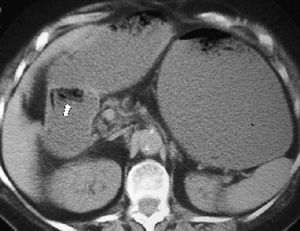 La más frecuente es el ulcus duodenal, que asienta normalmente en el bulbo. Por lo general la ecografía y la TC no son los estudios solicitados para su diagnóstico. Ecográficamente se puede visualizar un engrosamiento focal de la pared duodenal con imagen lineal ecogénica correspondiente a la úlcera14. En ocasiones puede provocar estenosis y retención gástrica. La existencia de perforación se sospecha ante un engrosamiento de la pared con líquido periduodenal y aire libre intra o retroperitoneal, hallazgo este último más fácilmente visualizable con TC15 (fig. 7).